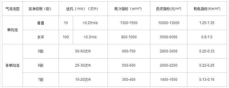 注:表中的送風量、單向流以斷面風速表演示,非單向流以換氣次數表示。